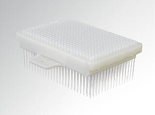 The CyBio Well vario includes an automated base which accepts different interchangeable simultaneous pipetting heads. The heads can be changed quickly and easily either at the front or the back of the instrument. After head exchanges the calibration maintains. A working volume range of four orders of magnitude allows liquid transfers from 25 nl up to 250 µl on one platform, either with 96 or 384 disposable tips.