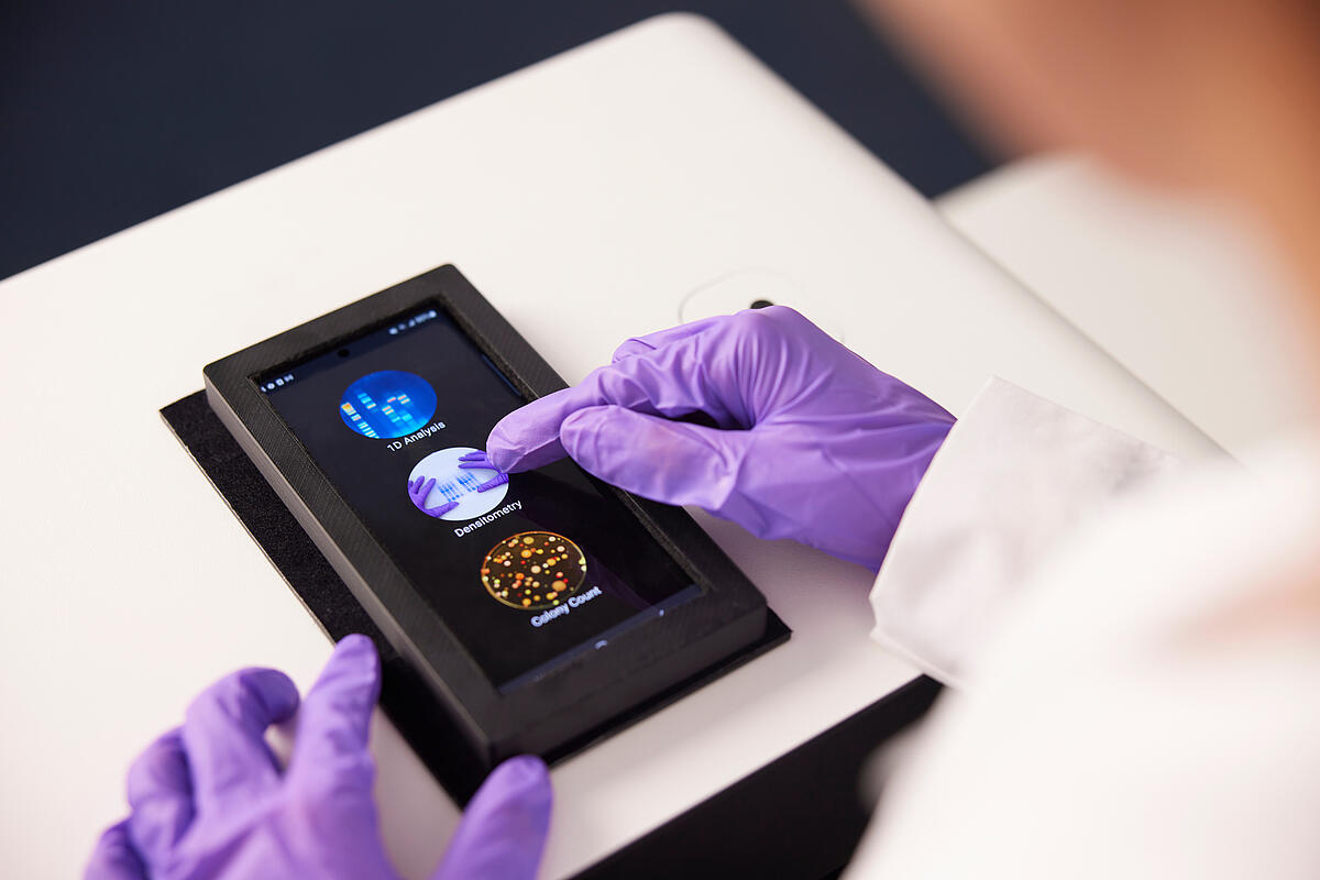The system features a 302 nm wavelength transilluminator, overhead white and blue LEDs, and phone holder/adapter that can accommodate most phone sizes on the market.